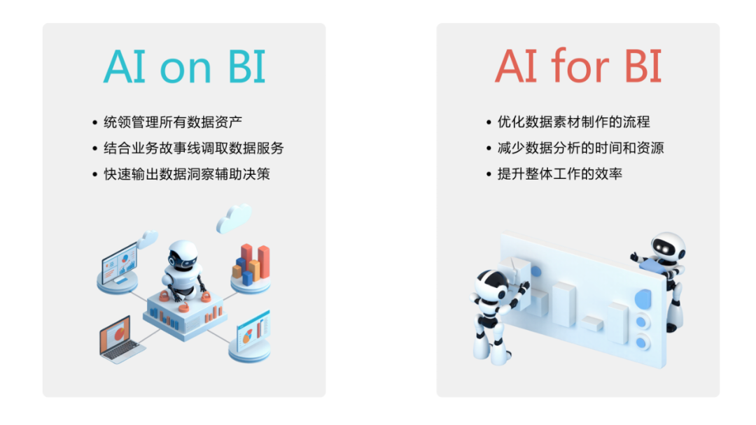BI 是站在更高视角管理BI素材以发挥更大价值,AI for BI 则侧重于微观层面的辅助支持。AI on