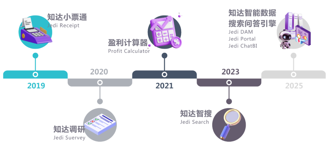 早在2019年,知达就自主研发了智能软件产品“小票通”。搭载了智能图像识别的票据数据应用,是知达早期在数据产品解决方案上的成功探索。随后,基于知达对零售数据的场景的深刻认知,陆续开发了”盈利计算器“和”知达调研“,企业多模态组合计算器和具备深度洞察的调研平台。近两年,随着大模型的快速发展和大范围的应用,知达也紧跟技术趋势,研发了基于规则引擎的第三代搜索试BI “Jedi Search",在AI技术加持下实现精准的Text to SQL。