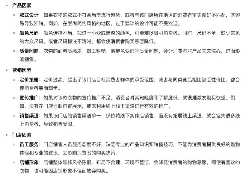 最终会产出一张表格,来展示所有门店的针织衫滞销情况。随后,用户要求大模型完成分析,大模型会给予互联网上的资料或者行业一般经验来输出一些归因分析内容。AI on BI