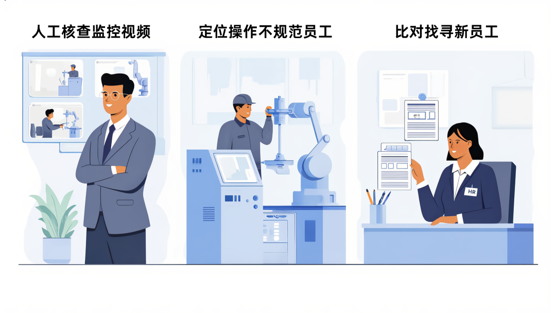 BI在一些传统制造业企业里,处理这个问题的流程和步骤就比较复杂了。涉及人工审查工厂的监控视频,耗费很大力气的定位到故障发生时的操作人员的信息,最终再与人事总信息表比对,来找出新员工。在这个过程中,AI能在监控视频的图像识别和人员比对过程中发挥一定的作用。