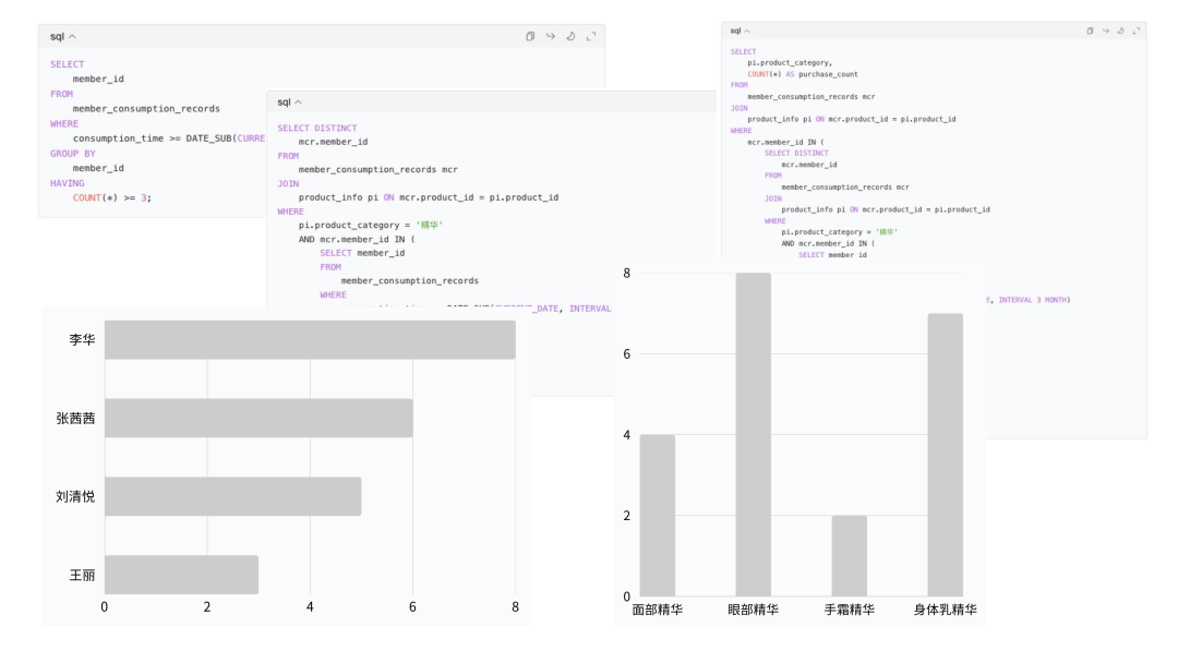 BI会辅助生成几个简单图表实现分析。- 用户拆解1:筛选出近三个月消费满 3 次的会员(SQL)- 用户拆解2:筛选出购买过精华类化妆品的会员(SQL)- 用户拆解3:统计这些会员常买的其他品类(SQL)